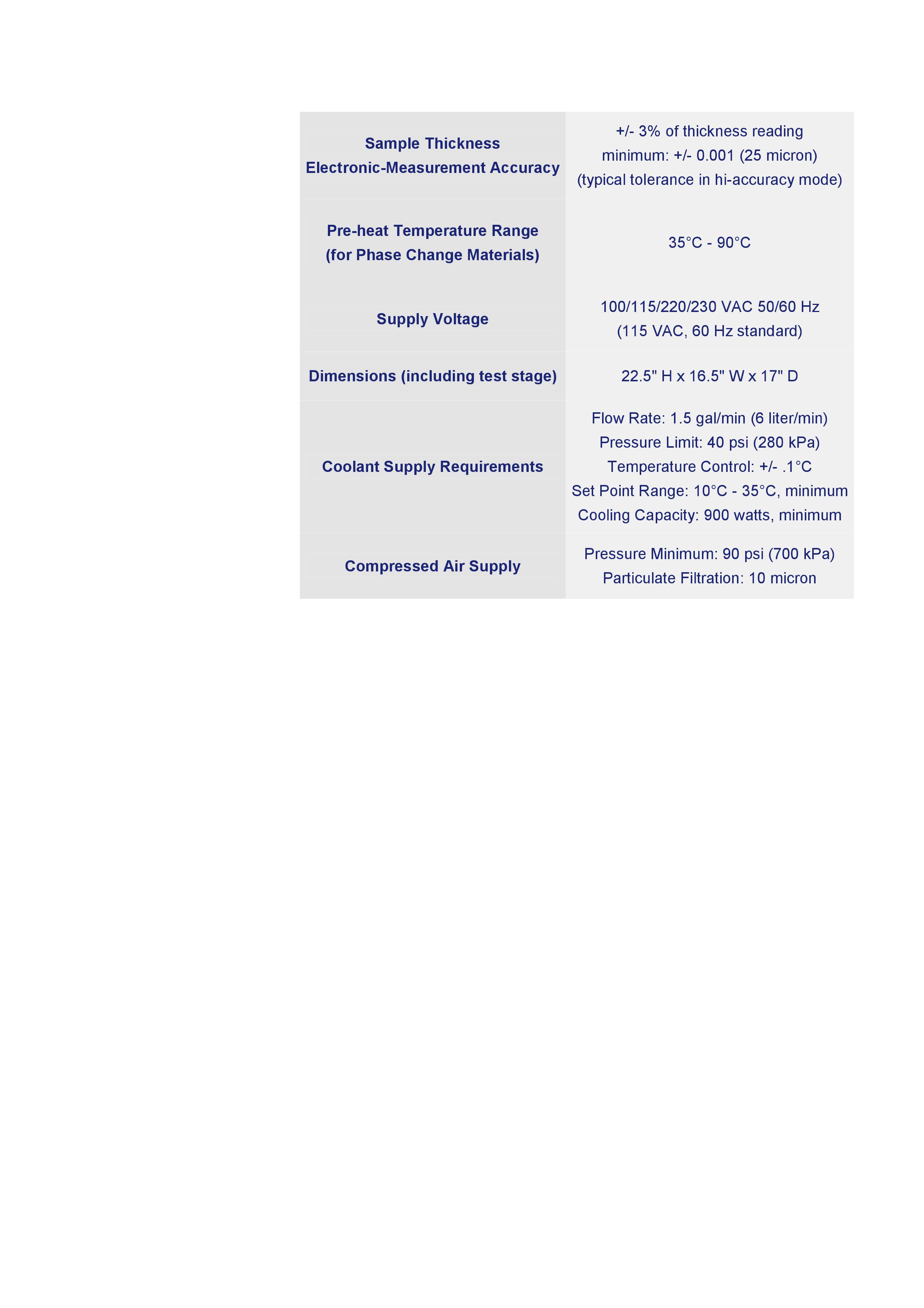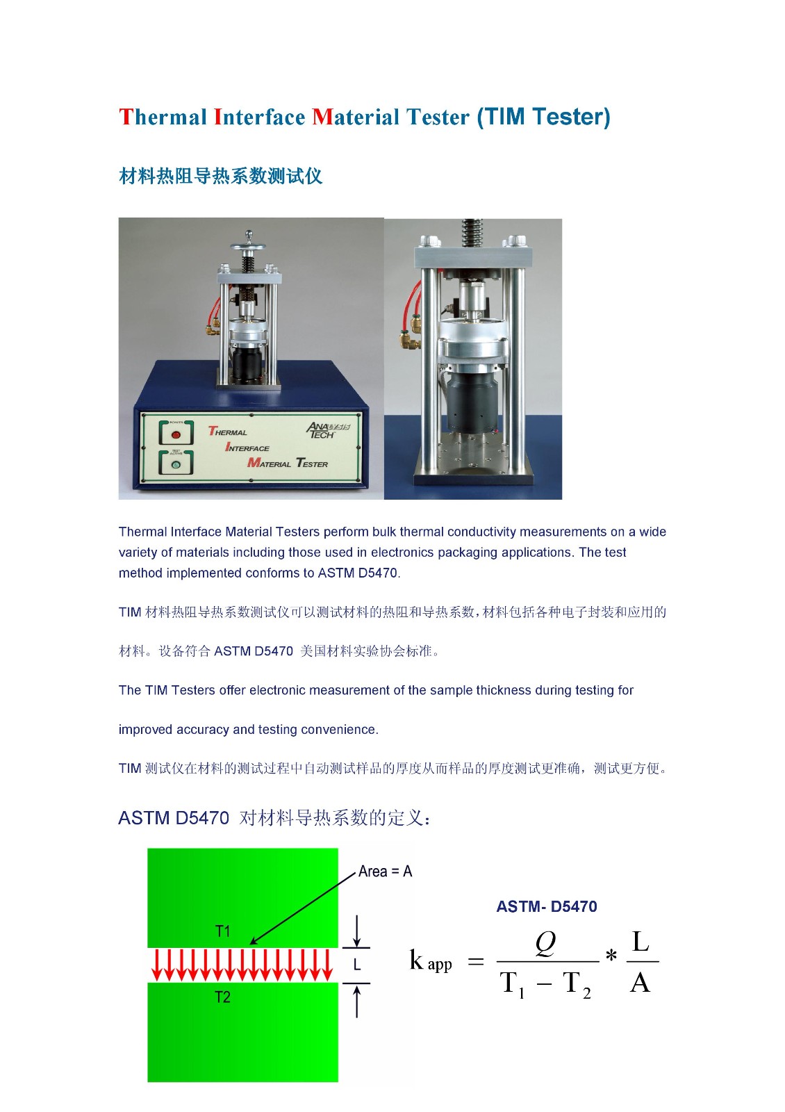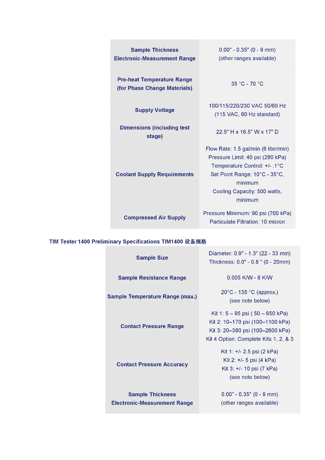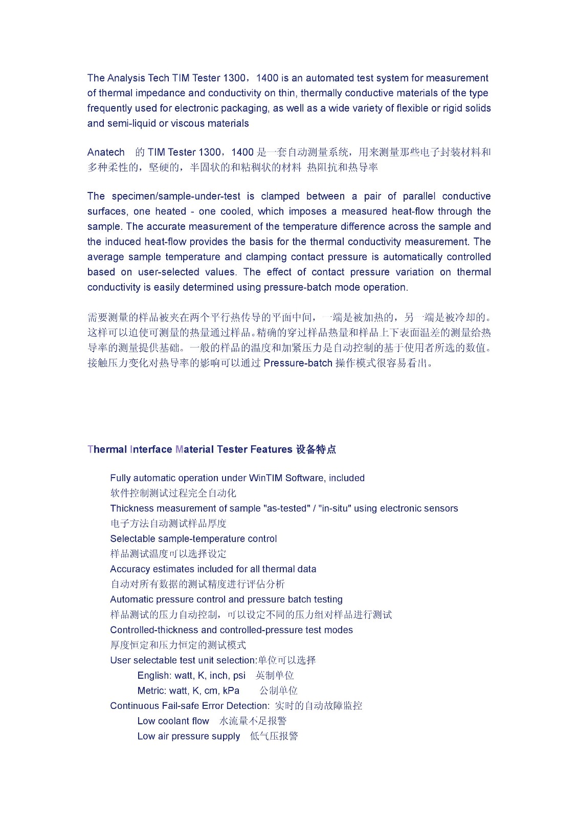 Anatech 的TIM Tester 1300,1400是一套自動測量系統(tǒng),用來測量那些電子封裝材料和多種柔性的,堅硬的,半固狀的和粘稠狀的材料熱阻抗和熱導(dǎo)率需要測量的樣品被夾在兩個平行執(zhí)行熱傳導(dǎo)的平面中間,一端是被加熱的,另一端是被冷卻的,這樣可以迫使可測量的熱量通過樣品。精確的穿過樣品熱量和樣品上下表面溫差的測量給熱導(dǎo)率的測量提供基礎(chǔ)。一般的樣品溫度和加緊壓力是自動控制的基于使用者所選的數(shù)值。接觸壓力變化對熱導(dǎo)率的影響可以通過Pressure-batch操作模式很容易看出。
